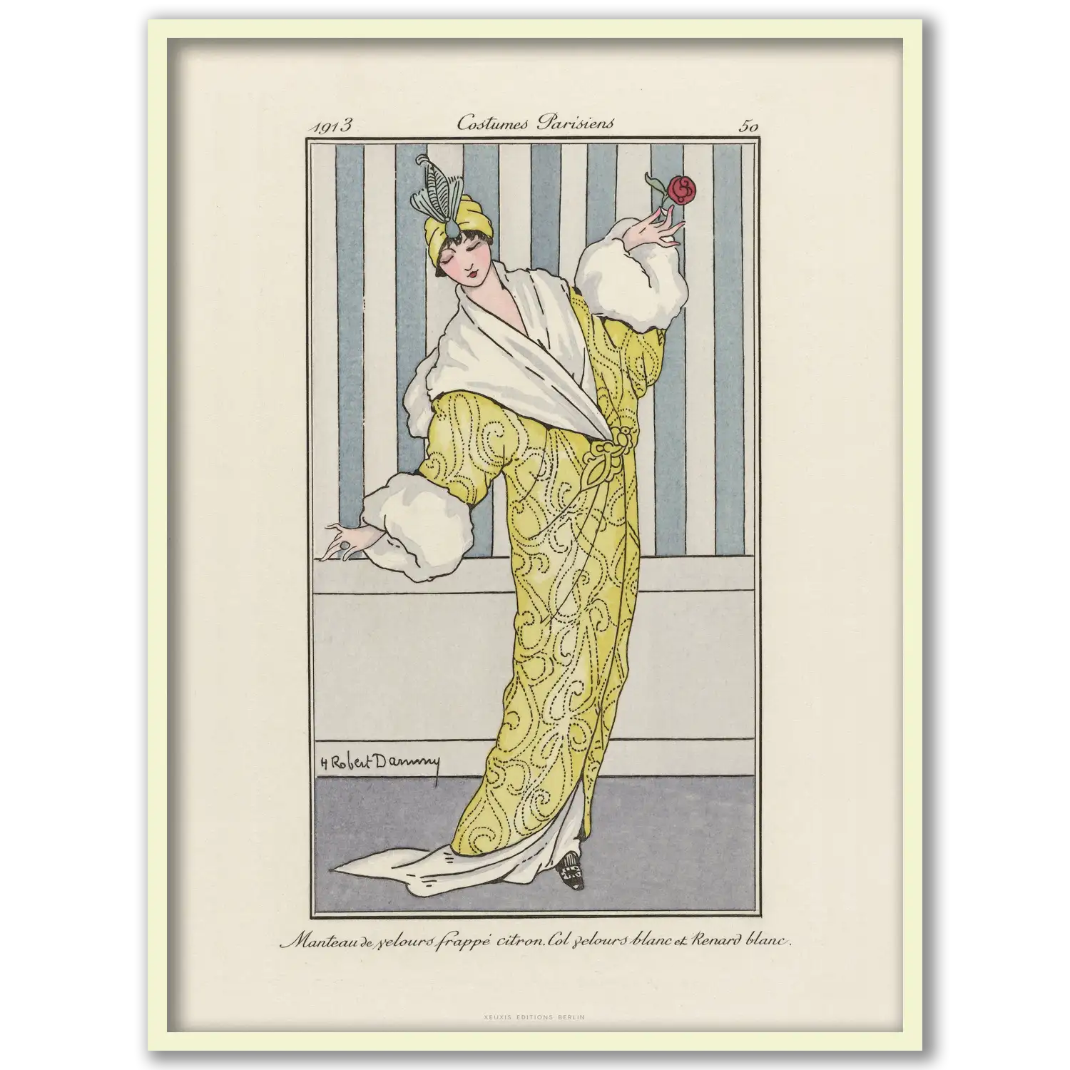 ‘Manteau de velours frappé citron. Col velours blanc et Renard blanc.’